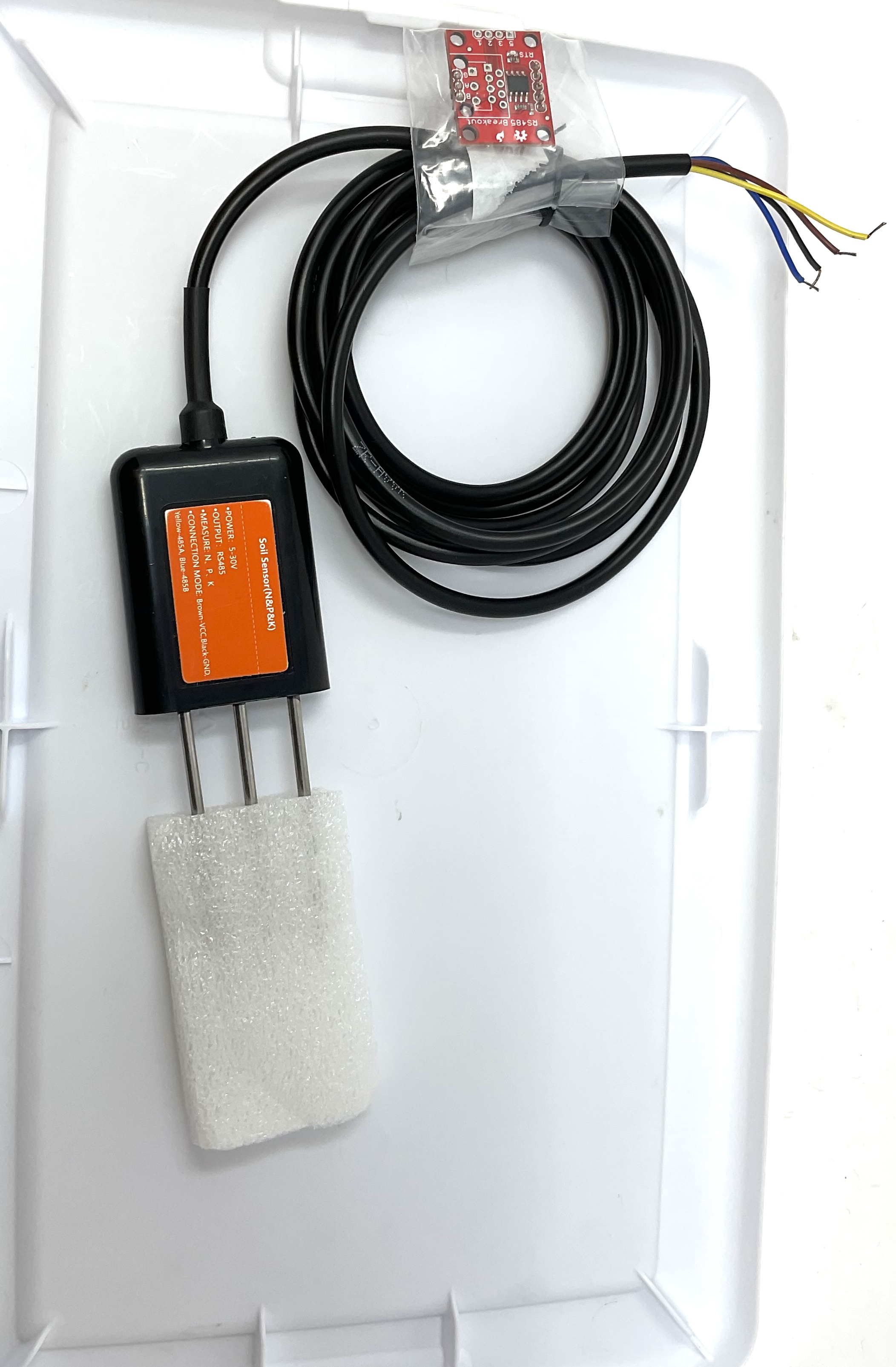 External NPK sensor (UART, Model: DFROBOT SEN-0462) and soil moisture & humidity sensor (I2C, Model: Stemma) were used to monitor soil health while keeping the main board safe from moisture and corrosion.