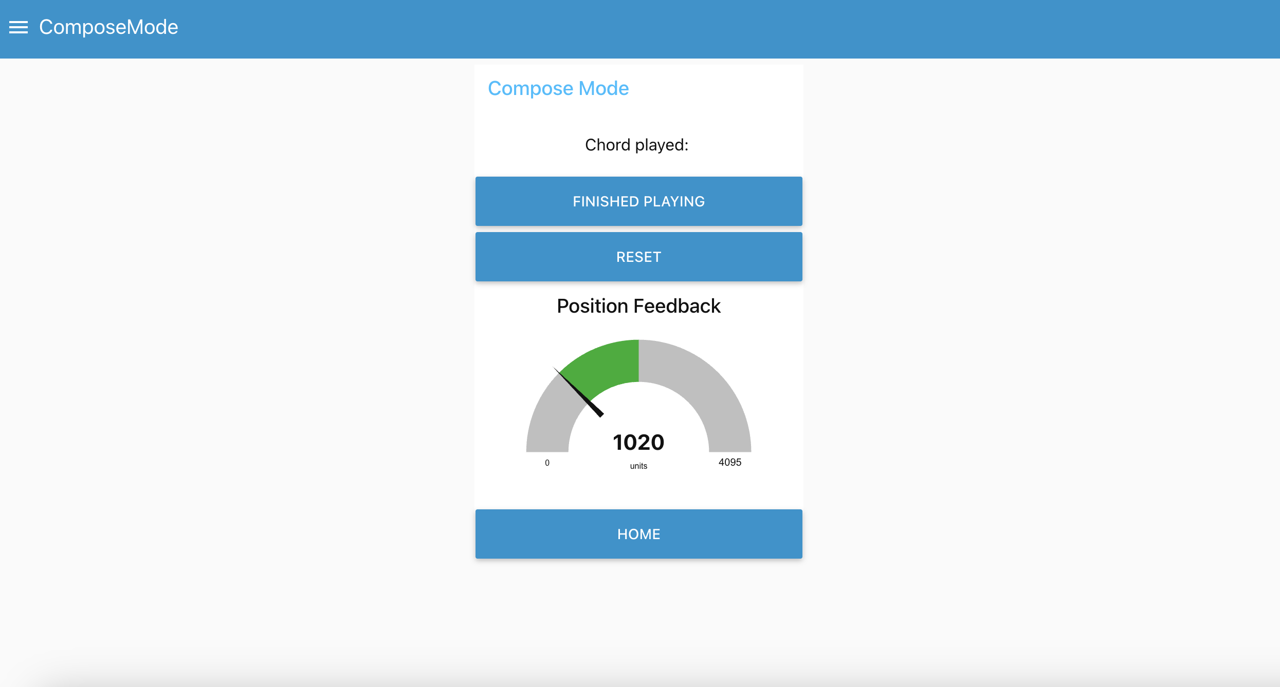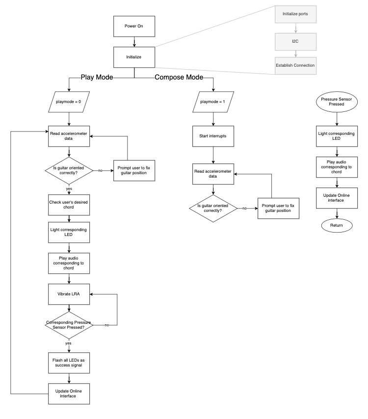 The device allows the user to choose between two modes. The first mode is loading specific songs from the online dashboard and prompting the user to play the chord and strum. The second mode is a “free compose” mode where the user can play chords and strum the guitar, and the online dashboard records the chord and strumming pattern, effectively allowing the user to compose their own music.