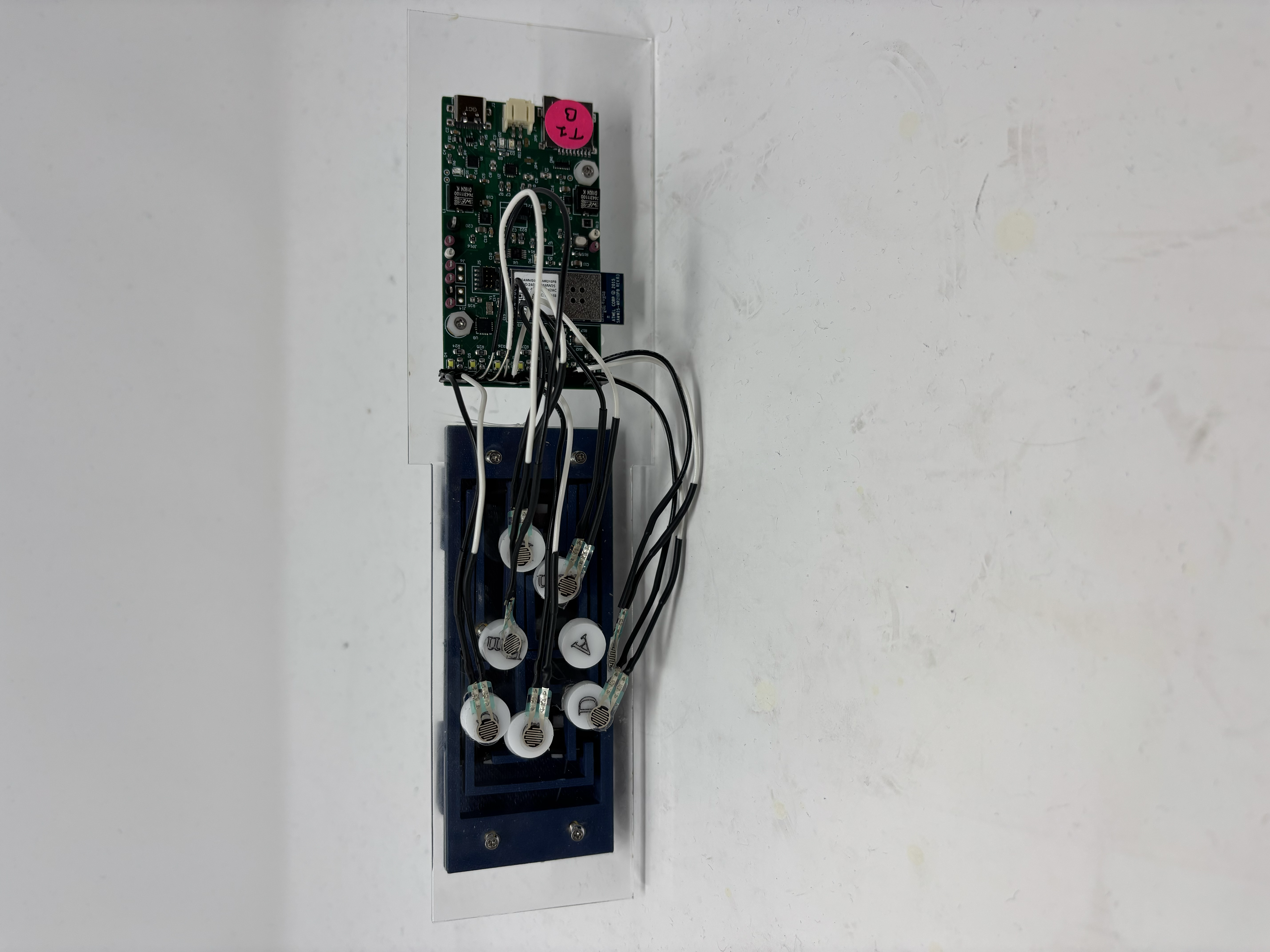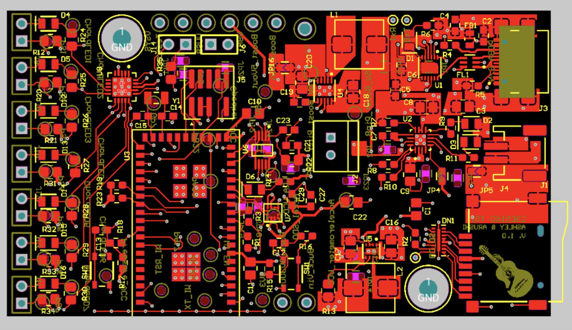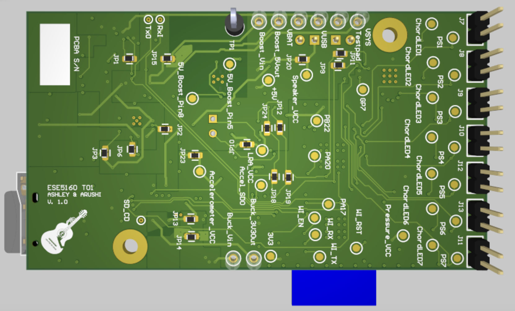 The device has four major components – an LRA (linear resonant actuator), accelerometer, pressure sensors, and LEDs. The LRA is used in the assistive guitar handle and prompts the user to strum the guitar strings whenever it buzzes. The accelerometer is used to provide positioning feedback on how the guitar is being held. Finally, the LEDs visually prompt the user to play a specific chord, and the pressure sensors detect if/when the chord is pressed.
