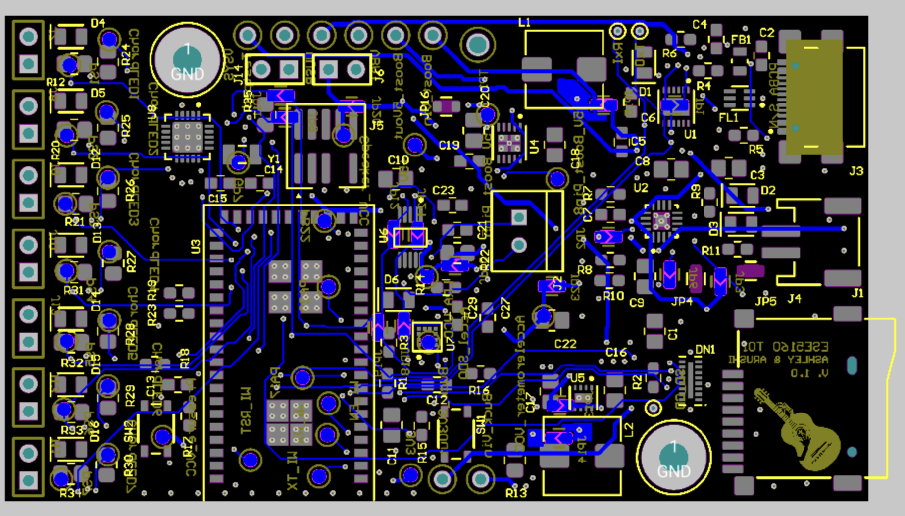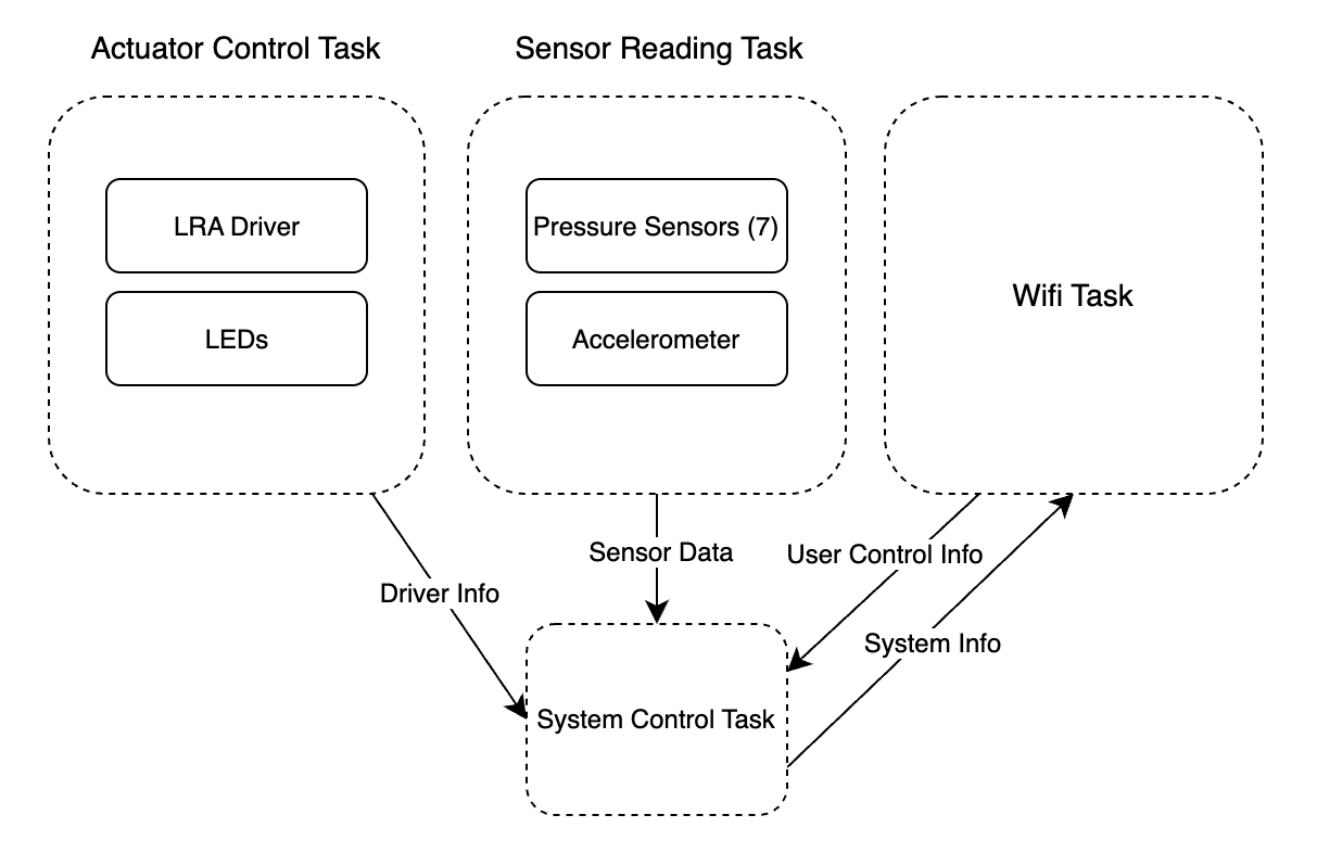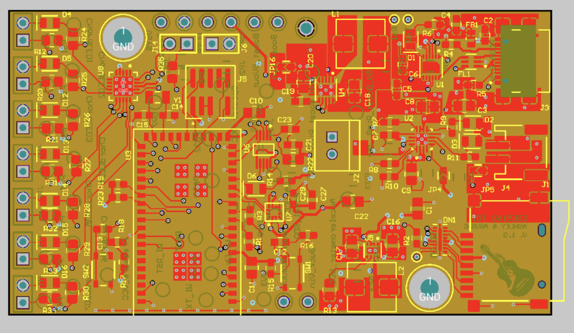 The device has four major components – an LRA (linear resonant actuator), accelerometer, pressure sensors, and LEDs. The LRA is used in the assistive guitar handle and prompts the user to strum the guitar strings whenever it buzzes. The accelerometer is used to provide positioning feedback on how the guitar is being held. Finally, the LEDs visually prompt the user to play a specific chord, and the pressure sensors detect if/when the chord is pressed.