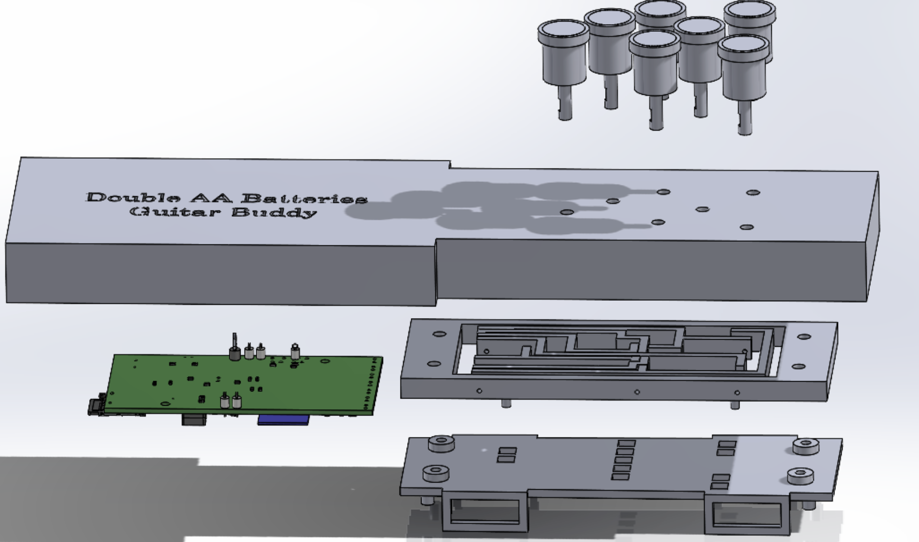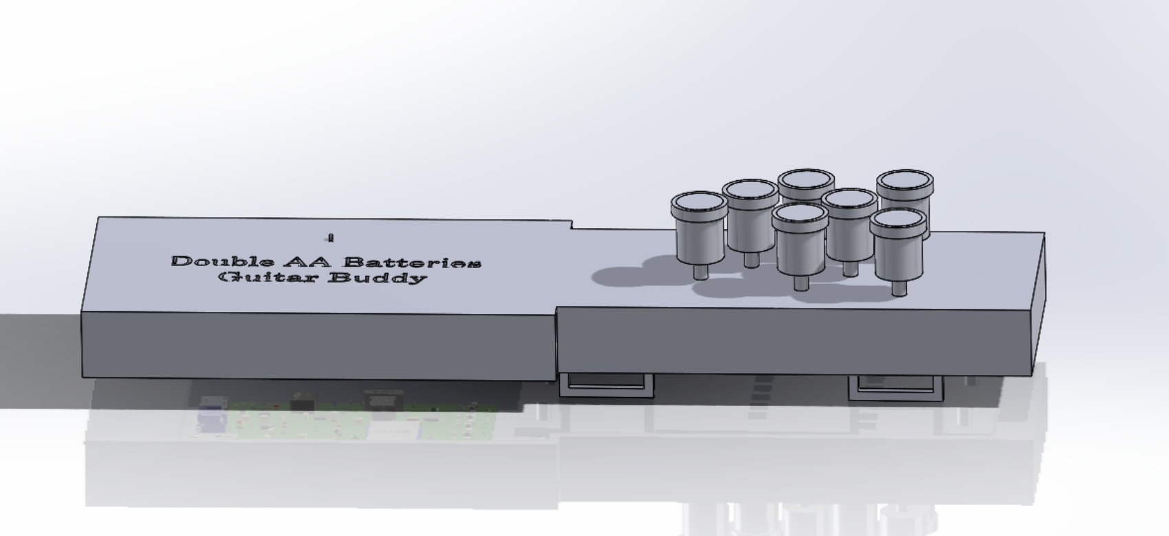 The Guitar Buddy is an assistive guitar trainer helping people with accessibility needs learn how to play the guitar through visual and tactile prompting. The Guitar Buddy has large buttons that the user can press as opposed to having to pressing multiple strings to play chords, as well as with an assitive guitar pick holder with haptic feedback of when to strum the strings and uses IoT as the user interface, allowing the user to select modes and view feedback, creating a more friendly user experience.