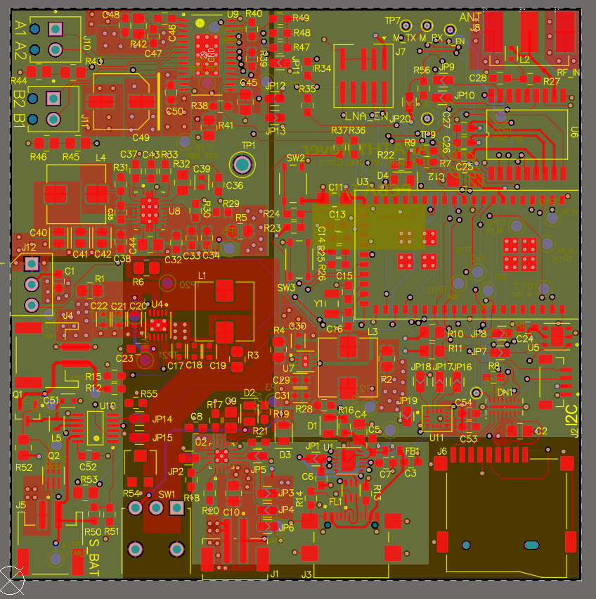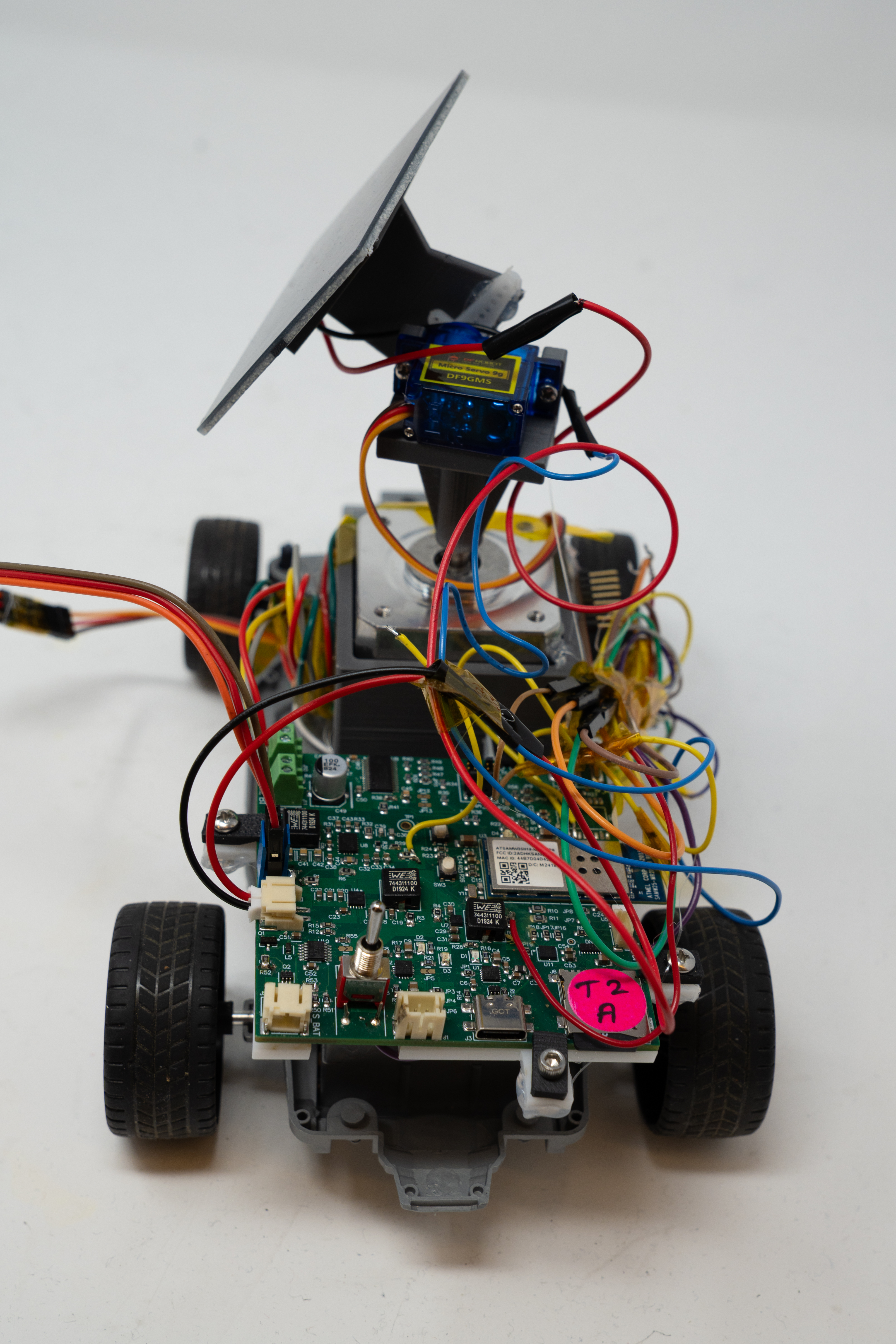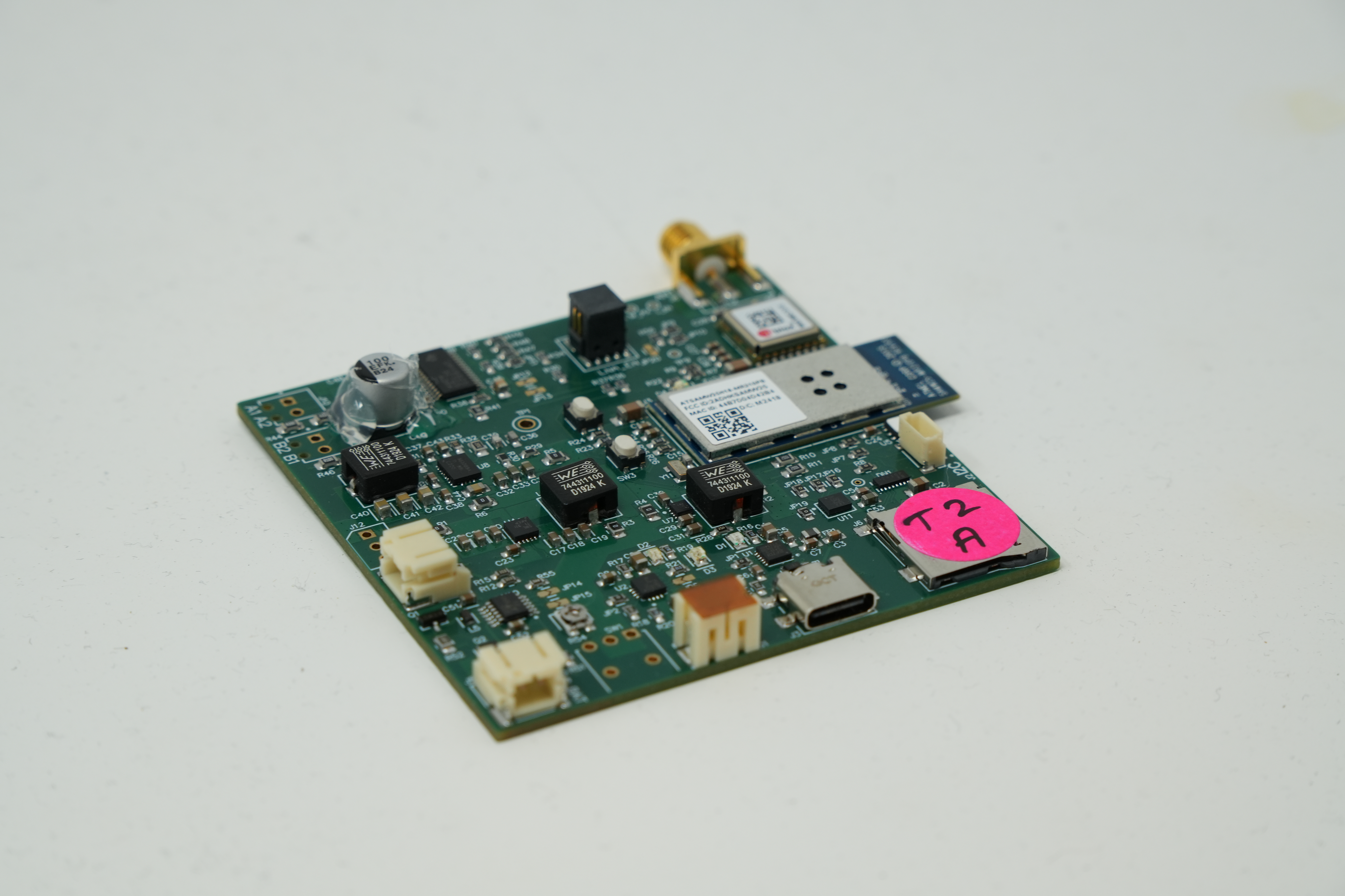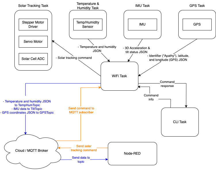 Our PCBA consists of a multitude of sensing components such as a GPS for latitude/longitude coordinates, an IMU for tilt detection, a temperature and humidity sensor, and a solar cell as part of a larger solar tracking mechanism. It also integrates a stepper motor and servo motor for actuation of the solar cell. Our device communicates with the Node-RED dashboard through an intermediary MQTT broker, sending updated sensor information in real time and solar tracking commands back to the board. The system-level block diagram can be found here.