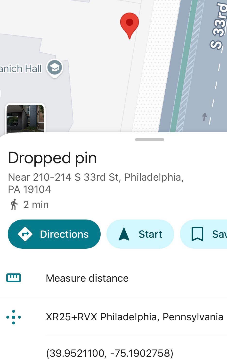** In our final video, at time 1:07 we see coordinates of (39.9520, -75.1904) and at 1:11 we see (39.9519, -75.1904), and the distance between these coordinates according to this distance calculator is 0.011 km, demonstrating that one “step” is ~11 m, which is slightly over our intended precision. However, the values are slightly inaccurate, as shown by the ss below, which shows the true Google Map coordinates of the location where our rover was at the time. We see that, correct to 4 decimal places, we get true coordinates of (39.9521, -75.1902), which is off by 0.02 km, double our intended accuracy.