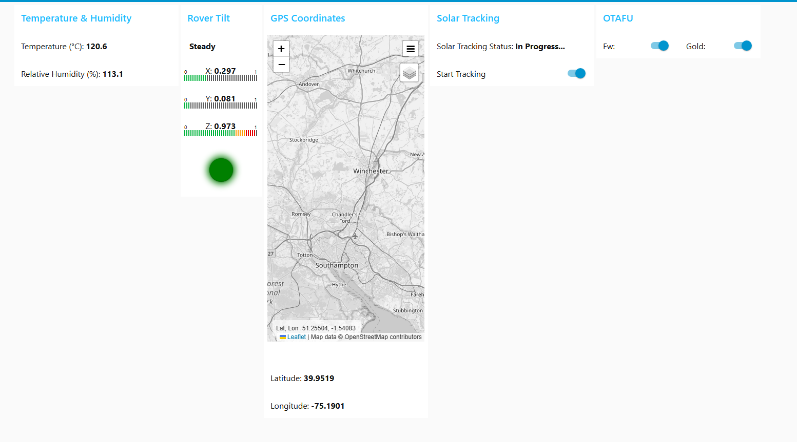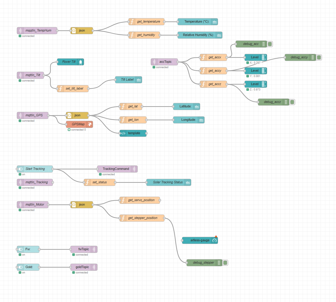 | HRS-W-01 | The WINC1500 will be used to send data packets containing peripheral data (GPS coordinates, temperature, humidity, tilt status, solar tracker charge, motor position) to the Node-red UI to be displayed. | ✅ (we sent GPS coordinates, tilt status, acceleration values, temperature and humidity readings) |